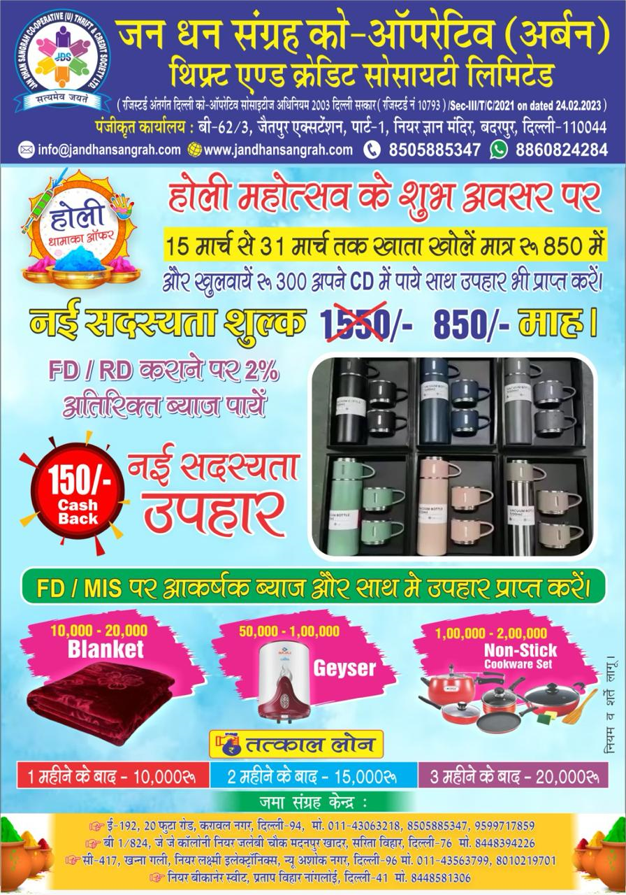 Jan Dhan Sangrah Co-operative (Urban) Thrift & Credit Society Ltd. registered under the Delhi Cooperative Societies Act 2003. The main goal of establishing this co-operative society is to promote financial freedom among people around us. The Society has its corporate office at Delhi. The norms and rules of working related to the Society have been outlined under the Bye-laws of the Society.